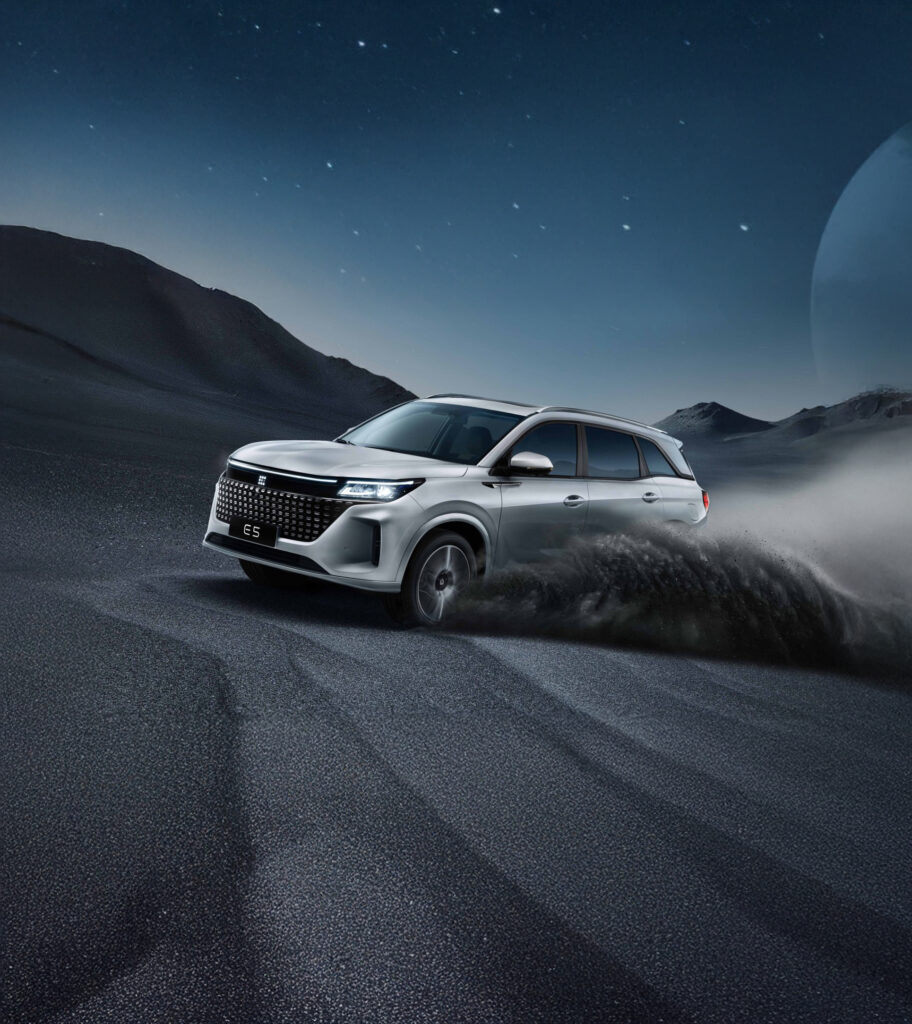 Con la eficiencia energética y la movilidad sostenible como prioridad, este E5 tiene un sistema híbrido enchufable (PHEV) compuesto por un motor naftero aspirado de 1.5 L de cilindrada, 4 cilindros y 16 válvulas, que genera 100 CV a 6.000 rpm y 128 Nm de par a 4.500 rpm, al que se une otro eléctrico que produce 130 kW (174 CV) y 300 Nm de torque, para lograr una potencia combinada de 217 CV (162 kW). La transmisión es una e-CVT y la tracción es delantera.