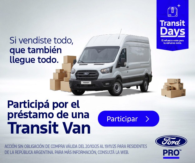 Posventa: 30% de descuento exclusivo en el próximo servicio de mantenimiento de Transit en cualquier Concesionario Oficial Ford. Propuesta válida del 15 de noviembre al 15 de diciembre de 2025 (abarca a todos los clientes Transit, no es condición anotarse en el concurso)