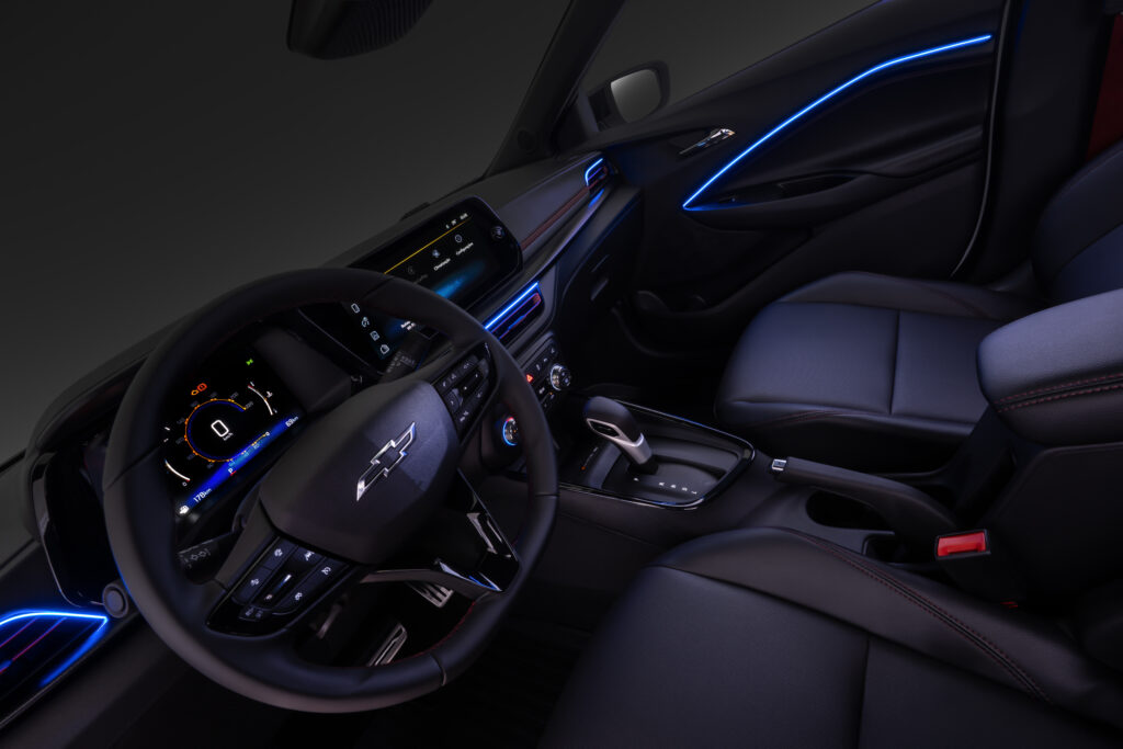 El tablero de líneas horizontales ayuda a ampliar visualmente el ancho del habitáculo y refuerza la atmósfera “high-tech” del interior. En esta configuración se destaca el Sistema de Cabina Virtual de Chevrolet, que integra el tablero de instrumentos digital de 8 pulgadas con la pantalla multimedia de 11 pulgadas, con conectividad avanzada, Wi-Fi nativo, servicios OnStar y capacidad de recibir actualizaciones remotas de software (over-the-air), manteniendo los sistemas siempre actualizados. Funciones del vehículo, como el encendido remoto del motor para preclimatizar el habitáculo, pueden controlarse a través de la aplicación myChevrolet.